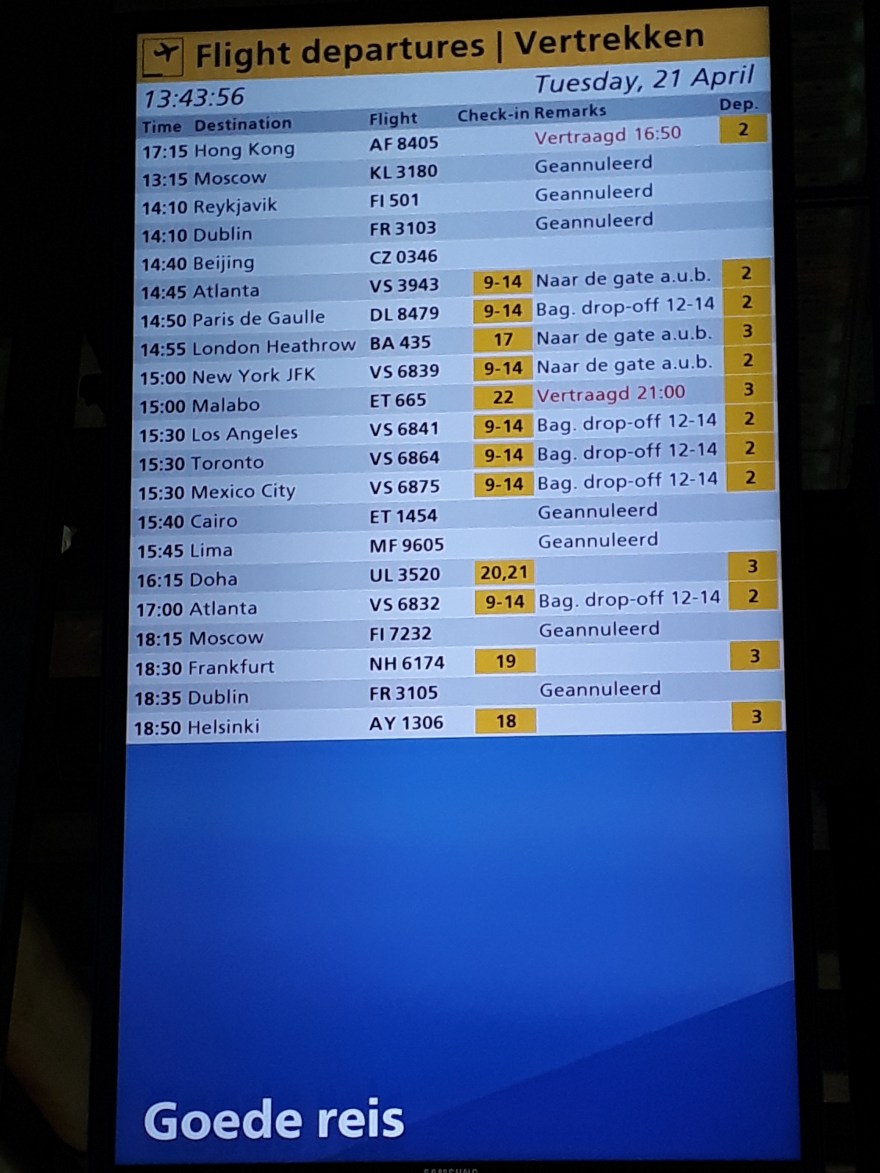It feels unnatural to see Schiphol deserted, as if some real disaster struck humanity, rather than a political decision to close down. Yet maintenance crews make good use of the opportunity. Damaged floor-tiles are marked and numbered, ready to be replaced. The ladies at the only occupied desk in the entire departure hall are happy to see any traveler. Super clean toilets, no waiting lines for security. Apart from thousands of people losing their jobs it’s wonderful!